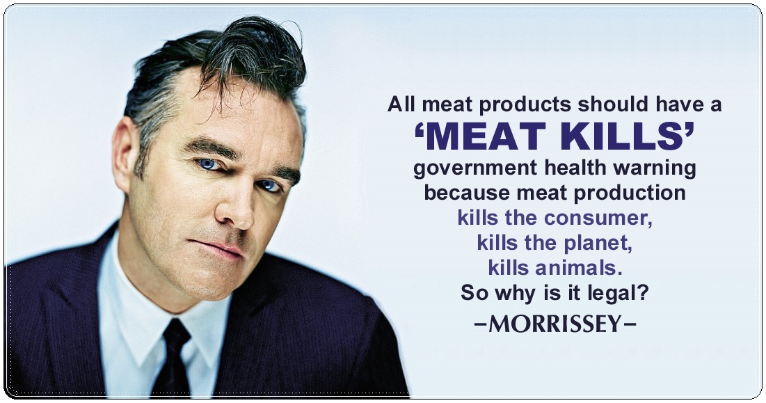 'All meat products should have a 'Meat Kills' government health warning because meat production kills the consumer, kills the planet, kills animals' -Morrissey.