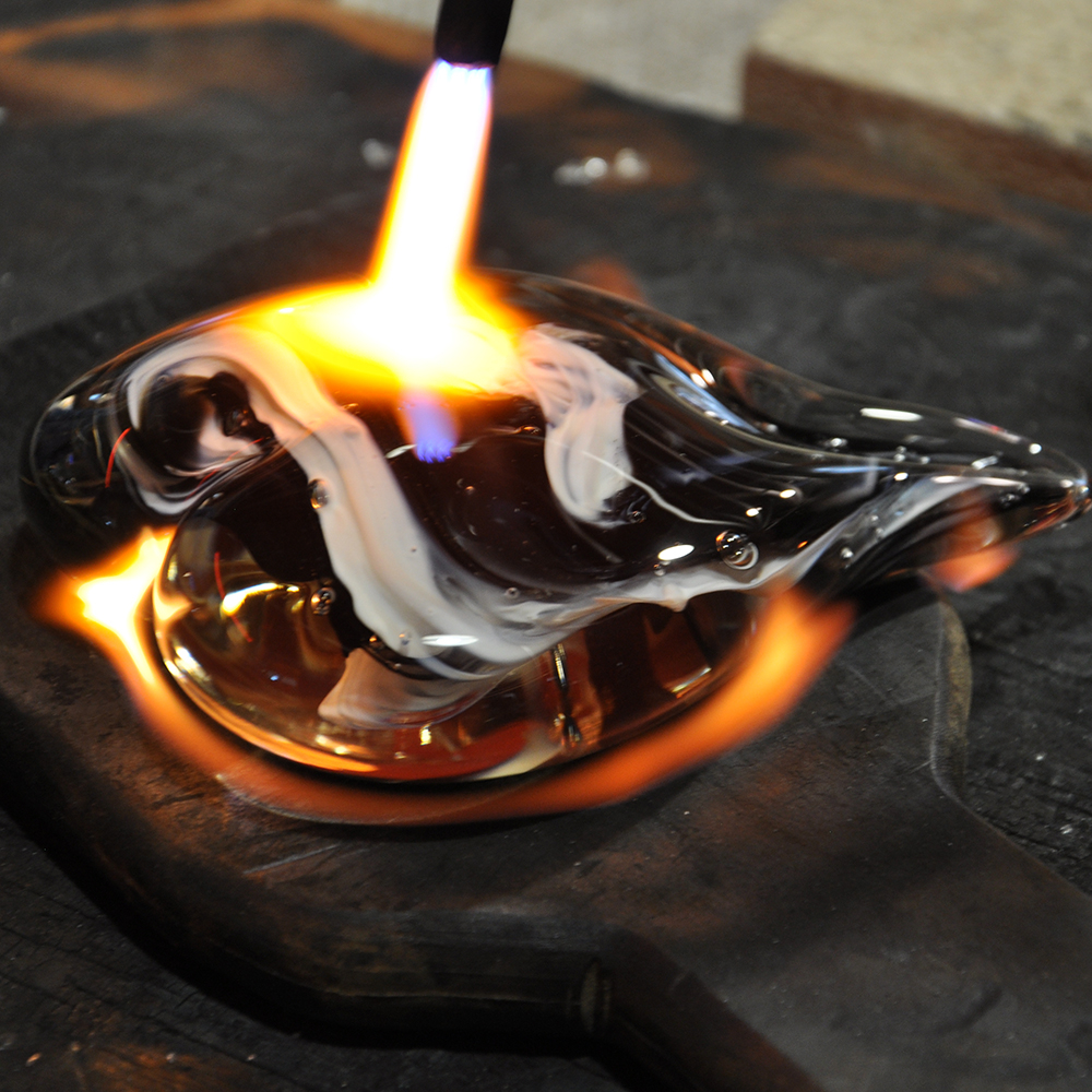Sometimes our artists get commissions to repair glassware--today Mike and Elin are making a duplicate stem to match this glass. Next it will be coldworked and glued to fix the one that got broken.