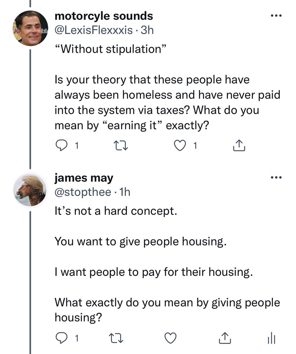 No, that’s not my point. You don’t even understand it. My point is that homeless people commit crime, this is well established, housing them without stipulation will not decrease crime.