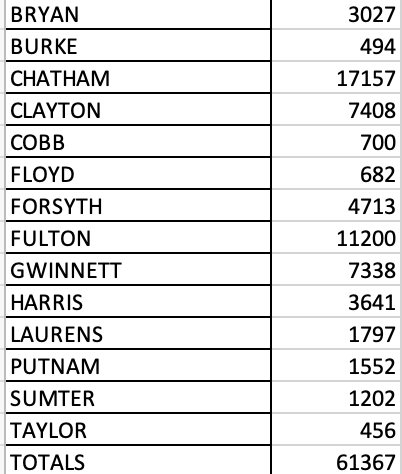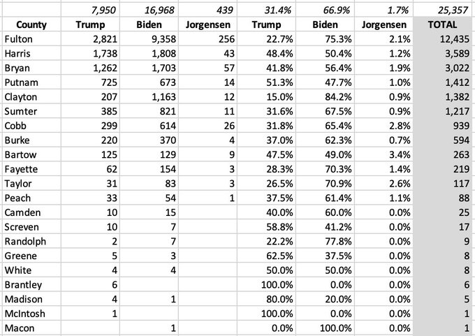 #gapol (Forsyth added some since, there's still provisionals etc.) Margin still <2k! Clayton County: 4,355 Cobb County: 700 Floyd County: 444 Forsyth County: 1,545 Gwinnett County: 4,800 Laurens County: 1,797 Taylor County: 456Show this thread -