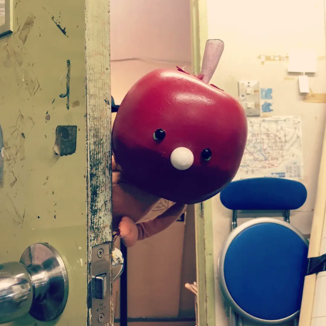 明後日16日から、全国に出かけての公演が始まる『りんごかもしれない』。美術部でお直ししてもらったりんご少年が、ひょこっと顔を出しました。 舞台で待ってるよ〜♪
