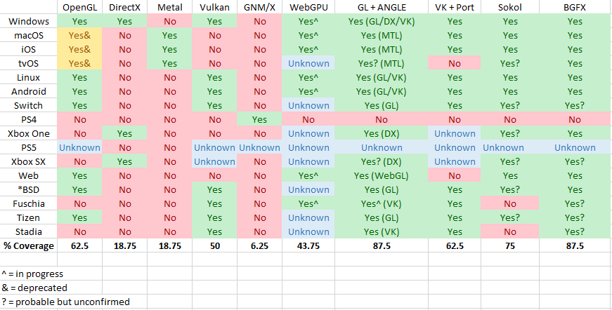 I've seen a lot of confusion and uncertainty recently about which graphics APIs are viable for cross-platform support. Here's a little matrix I compiled that compares all the major graphics APIs and platforms, so you can easily see what's supported where.pic.twitter.com/icokozn19N