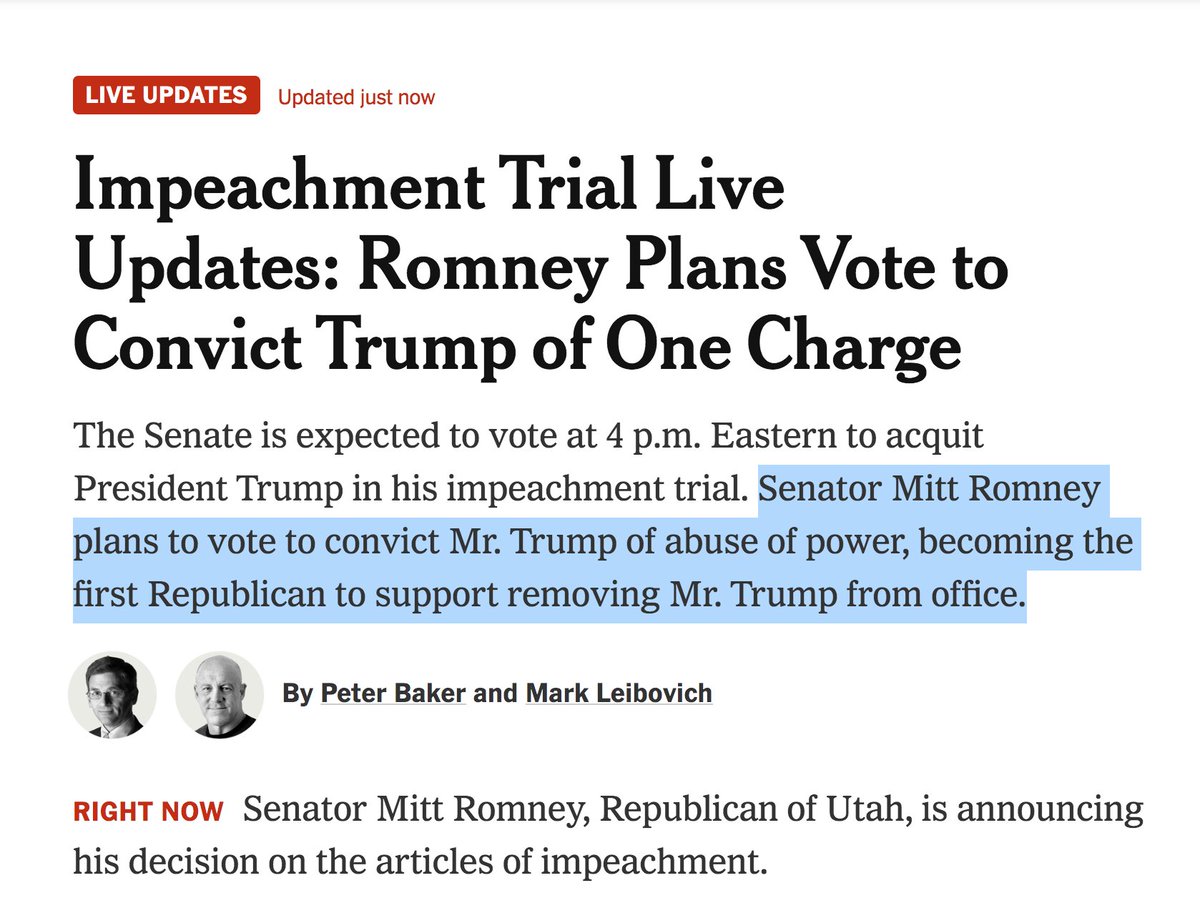 "A flagrant assault on our electoral rights" - Sen. Mitt Romney becomes the first Republican to vote to convict Donald Trump. https://www.nytimes.com/2020/02/05/us/politics/impeachment-vote.html?action=click&module=Spotlight&pgtype=Homepage …pic.twitter.com/VFMcBIfzwH