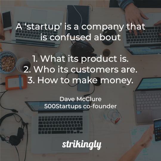 A ‘startup’ is a company that is confused about 1. What its product is. 2. Who its customers are. 3. How to make money. – Dave McClure, 500Startups co-founder