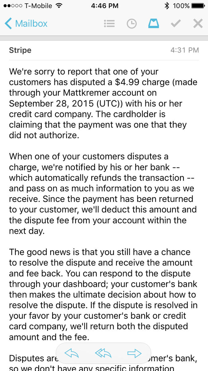 @matthewkremer We can look into this dispute more for you, if you'd like. Can you send us a message at http://support.stripe.com/email ?