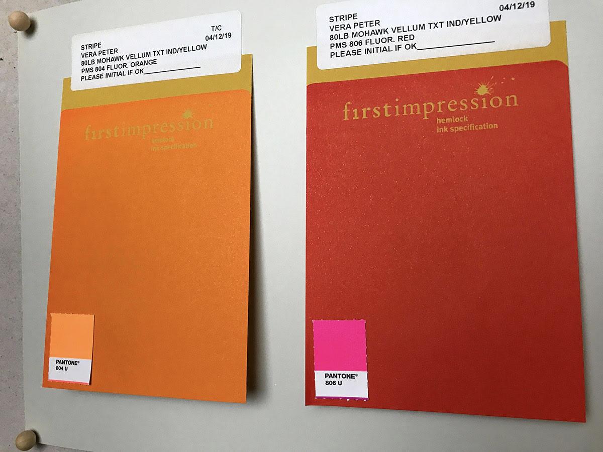 When choosing a color for the orange and red inks, we had to consider how that color would change when printed on yellow paper. You can see here how the fluorescent orange and red Pantone chips end up much darker colors when printed on the yellow paper.pic.twitter.com/4iDSbdVyV9