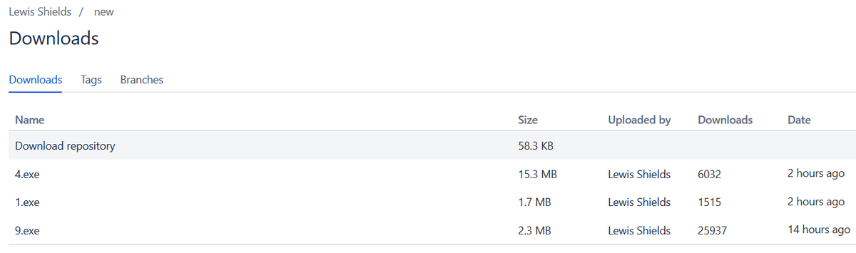 @Bitbucket repository. Files are 1 hour old and show a few thousand downloads. 19 hours old sample has 36609 downloads.