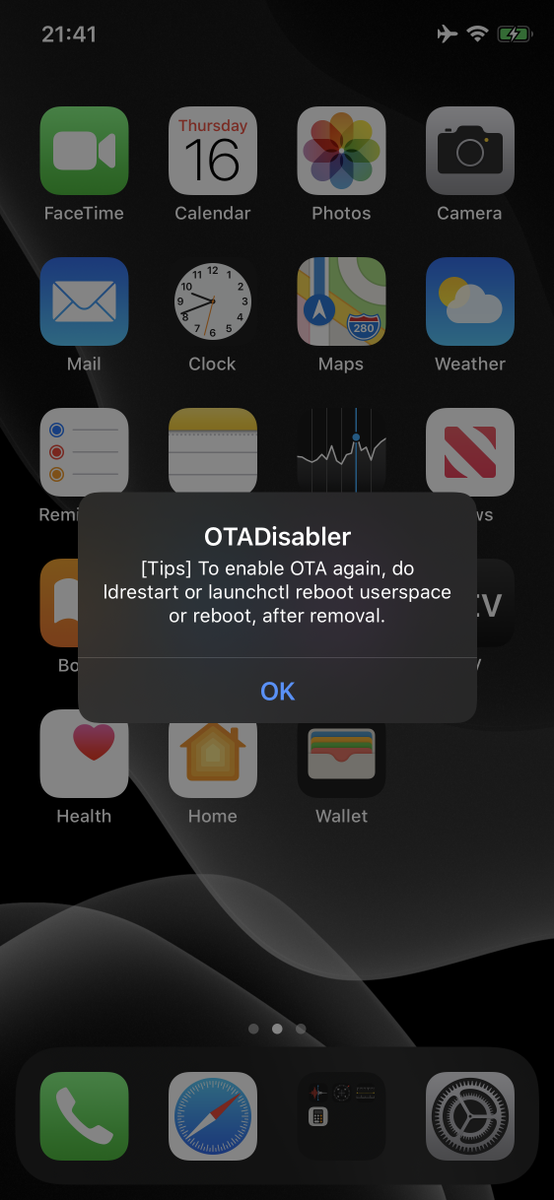 Update: OTADisabler v0.1-8 Re-enable OTA updates Run the following after removing the package: - ldrestart - launchctl reboot userspace - reboot PowerSelector recommended Repo: http://cydia.ichitaso.com https://cydia.ichitaso.com/depiction/otadisabler.html …pic.twitter.com/zYkgvb7Wl2