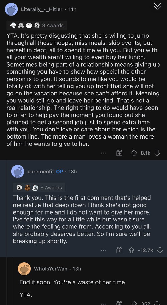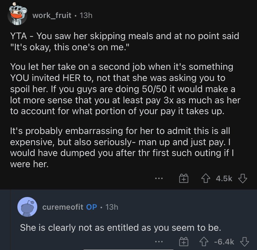 I hope this one is fake, I don't see how he could include the details he included and not realize he's being TA She's took on a second job just for this vacation, he can't even be bothered to cover the cost of a few meals for her when he definitely can afford it?