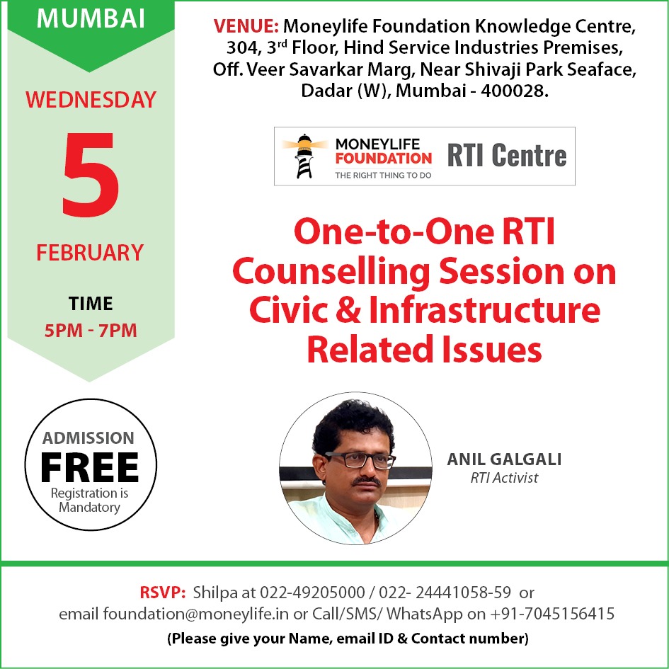 Join us Tomorrow Wednesday, 5th February 5 pm for one-to-one counselling on all issues related to RTI. Bring all necessary documents along. PS: Prior appointment compulsory.
