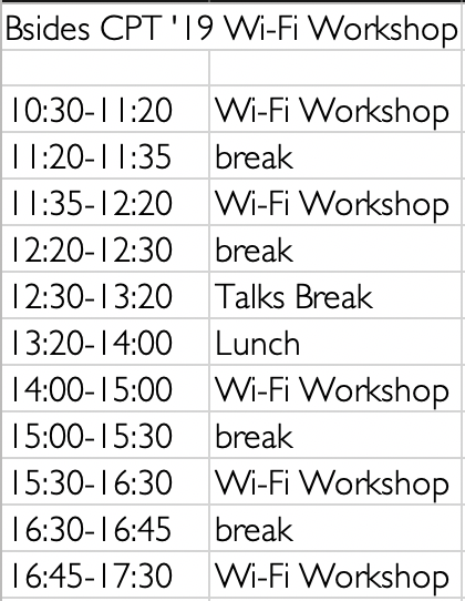 @BSidesCapeTown WiFi workshop tomorrow, here are the times we'll be running. I've matched them to the con schedule so you can still see hall way con, opening & closing talks &@leonjza's or@SILENTDZIKITI's.pic.twitter.com/0aP28eGBXb