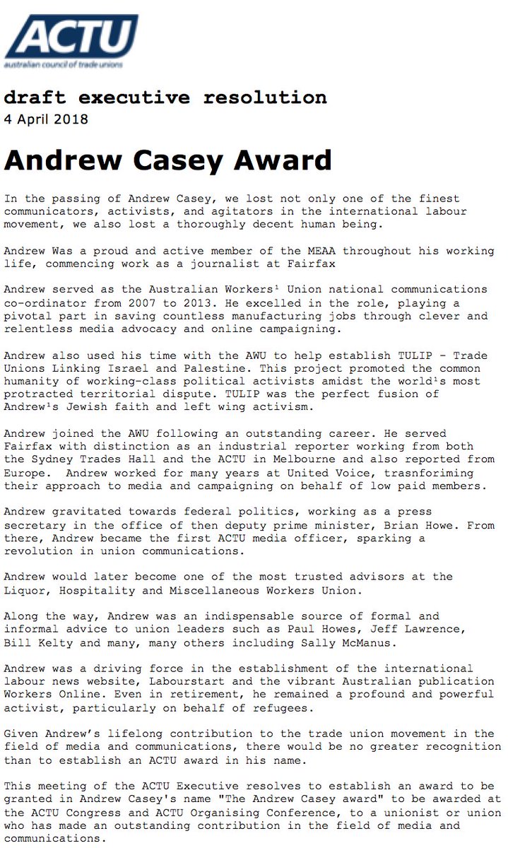 A proud moment this week when the ACTU Exec unanimously endorsed the creation of the 'Andrew Casey Award'. A great way to recognise Andrew's amazing contribution to the Trade Union movement. Special thanks to