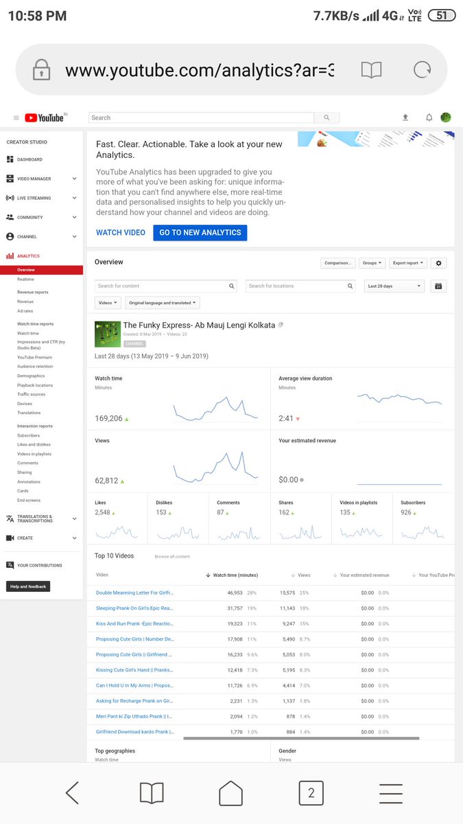 @TeamYouTube Dear YouTube Team, Last three days not updated watch time on my channel. Please fixed it. Thank you. Channel URL :http://www.youtube.com/c/TheFunkyExpressAbMaujLengiKolkata …