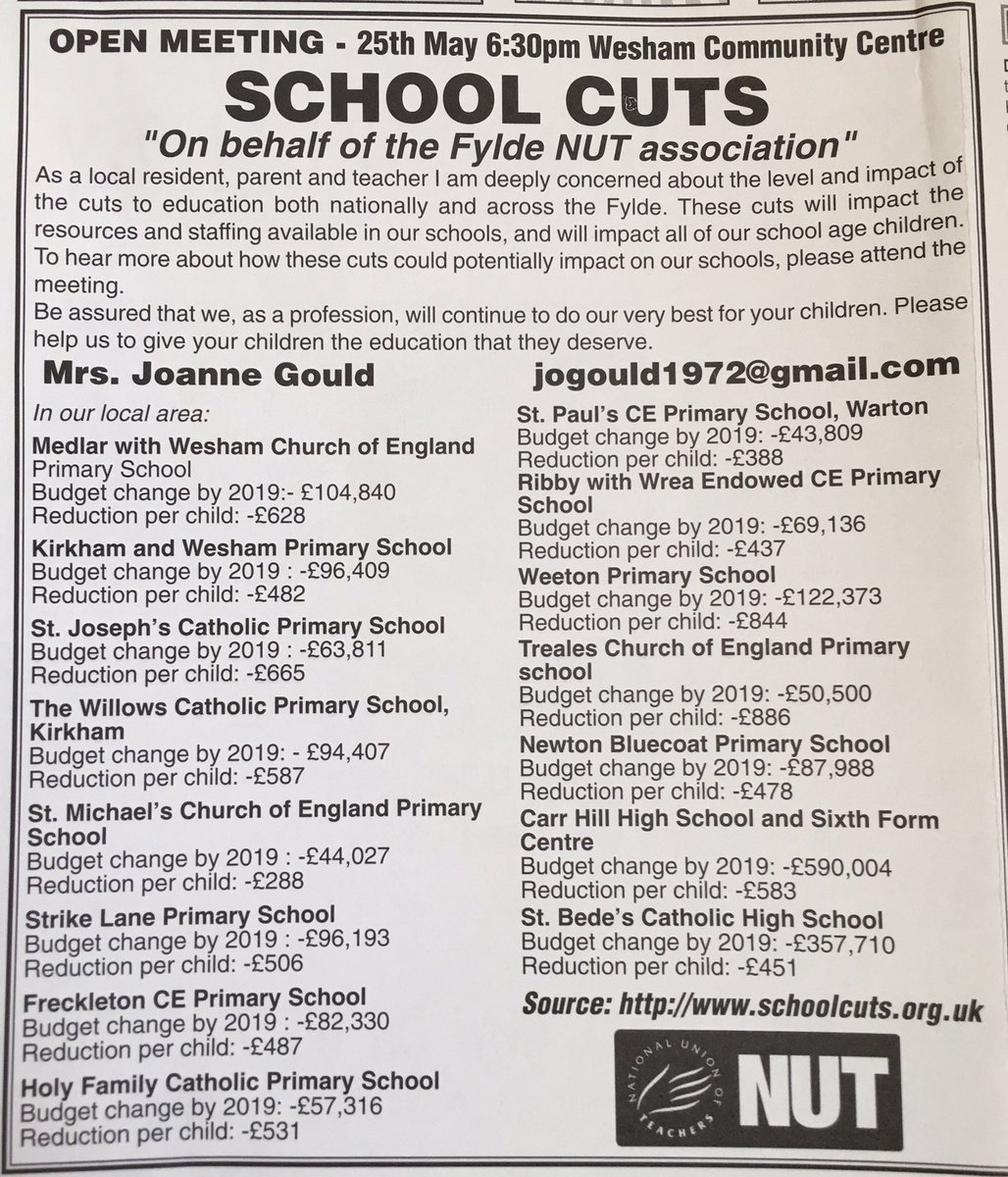 Meeting about school cuts across Fylde. Learn how your children's education is impacted by gov underfunding. 25th May, 6.30pm.pic.twitter.com/aP3kktxqgf