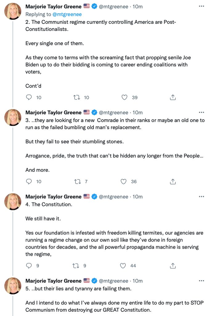 Refers to her political opponents as "termites" and describes a duly elected government as the "regime currently controlling America." This is a member of Congress. What would you say if you saw it in another country?pic.twitter.com/II1k0aU6p6