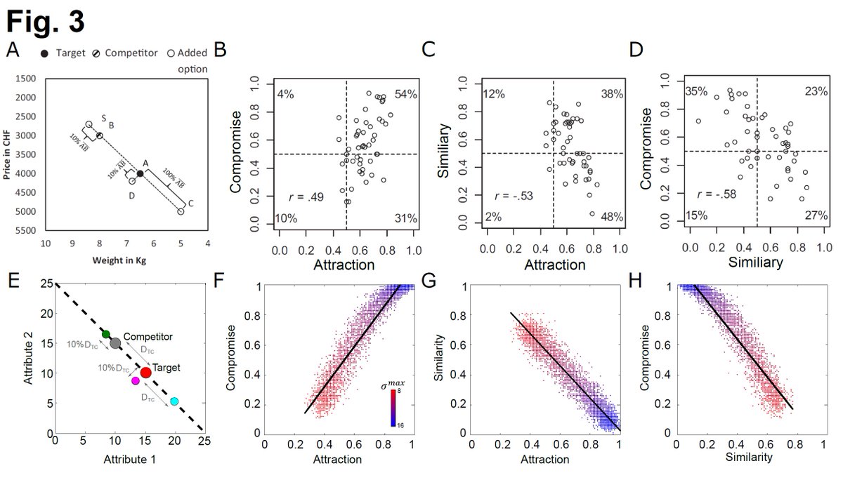 It turns out participants do not always exhibit all three decoy effects and have stereotypical intercorrelation pattern on the decoy effects. Our model is able to replicate the effect. Panel A-D reprinted from Berkowitsch et al. (2014) [11/n]pic.twitter.com/8uqdcveLwH