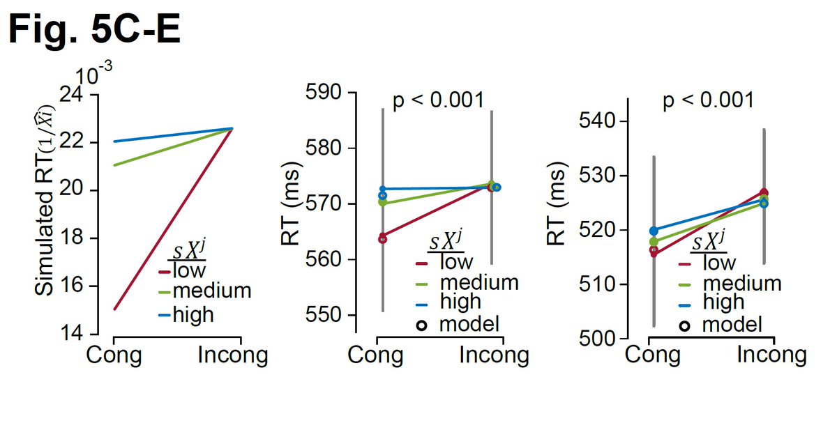 Our model counterintuitively predicts that under certain circumstances, there is a reversal of the conflict effect – that is, you are slower on congruent rather than incongruent trials (top-left corner).[18/n]pic.twitter.com/UEtIECZZM9