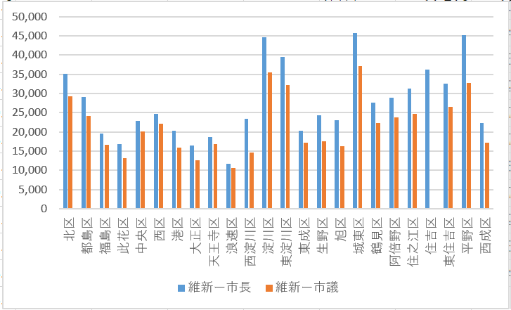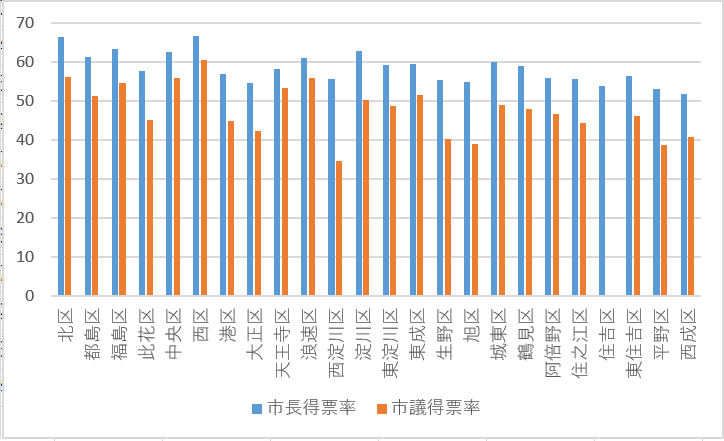 @myamadakg に言われて作りましたが、まあ維新においてはだいたい市長の得票数/率と市議の得票数/率は近いですね。相対的に維新の弱い区(特に西淀川区)でsplit-votingが起きてる印象でしょうか。pic.twitter.com/3OwF94x7l7