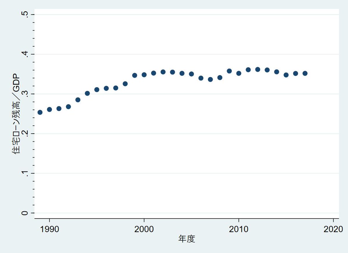 ただ,住宅ローン残高のGDP比率が日本は比較的に低くてレジーム的には非一貫的,というのはやや微妙では。引用されてるSchwartz and Seabrooke 2008を確認すると,このデータは1992-2002のデータ。推移をざっくり見ると,90年代後半からこの比率が急に上がるんですよね。pic.twitter.com/mc007IIkeF