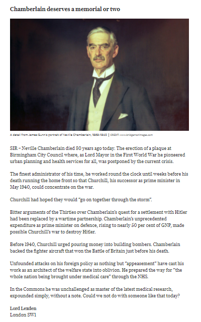 The next Telegraph letter argues that Chamberlain's reputation has been dominated by bitter arguments about "appeasement" (placed in inverted commas) and so calls for a rethinking of his historical legacy, with a more plural perspective on his legacies.pic.twitter.com/xG6HuVQWhL