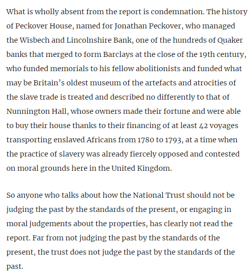 The report does exactly what its critics are asking the National Trust do. There is no "oh, and this was bad" anywhere in the report. The homes and collections of abolitionists and of slavers are treated in exactly the same way: https://www.newstatesman.com/politics/staggers/2020/11/national-trust-under-fire-crime-it-didnt-commit …