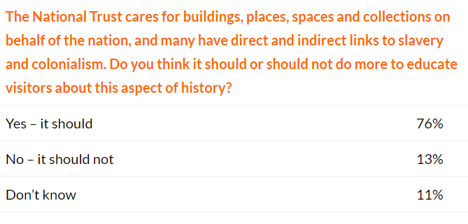 Should the National Trust do more to educate visitors about links to slavery and colonialism? @Policy_Exchange found 76% of the public think they should and 13% that they should not. Yet much ink spilled on Contested History by those imagining it is the other way around. pic.twitter.com/g0wF2fVYVS