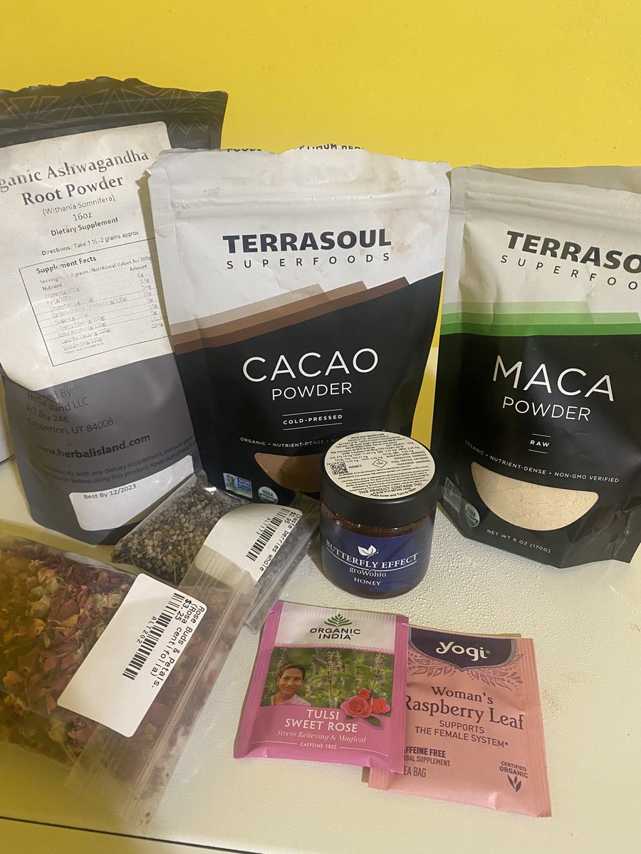 Some of my Divine Feminine Tea ingredients charged with a Rose Quartz
