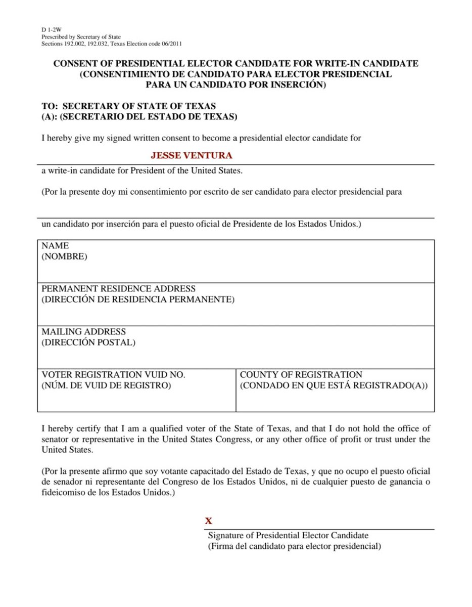 #DraftJesse is looking for 38 Texas electors to the electoral college for Jesse Ventura, we need 12 more by this Saturday. Sign up, go to http://draftjesse.com or print, fill out, sign and email this form to hello@draftjesse.compic.twitter.com/ye9SzkK1K6