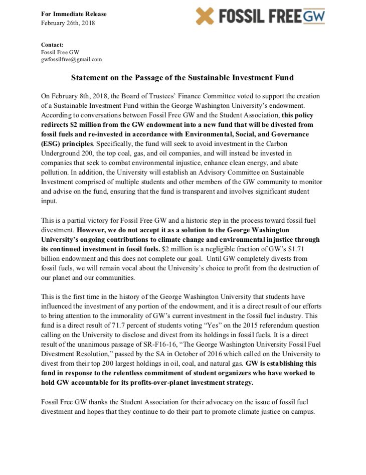 Thanks to the Student Association, for the first time, a portion of GW's endowment has been made transparent. This is not divestment, but it shows that student voices are being heard, and we will continue until every cent of the endowment is divested from fossil fuels.pic.twitter.com/sluhJ17dnP