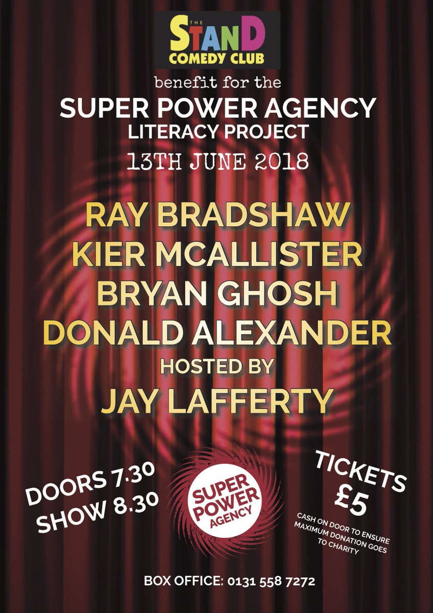 #youthliteracy and creativity! Join the Super Power Agency@superpow3 for an evening of comedy hosted by@StandComedyClub this Wednesday 21 June. Doors open at 7:30pm and tickets are £5. Raffle prizes! Laughs! Purchase tickets at the door.#scottishcomedy#writingpic.twitter.com/QeQvjS3NTn