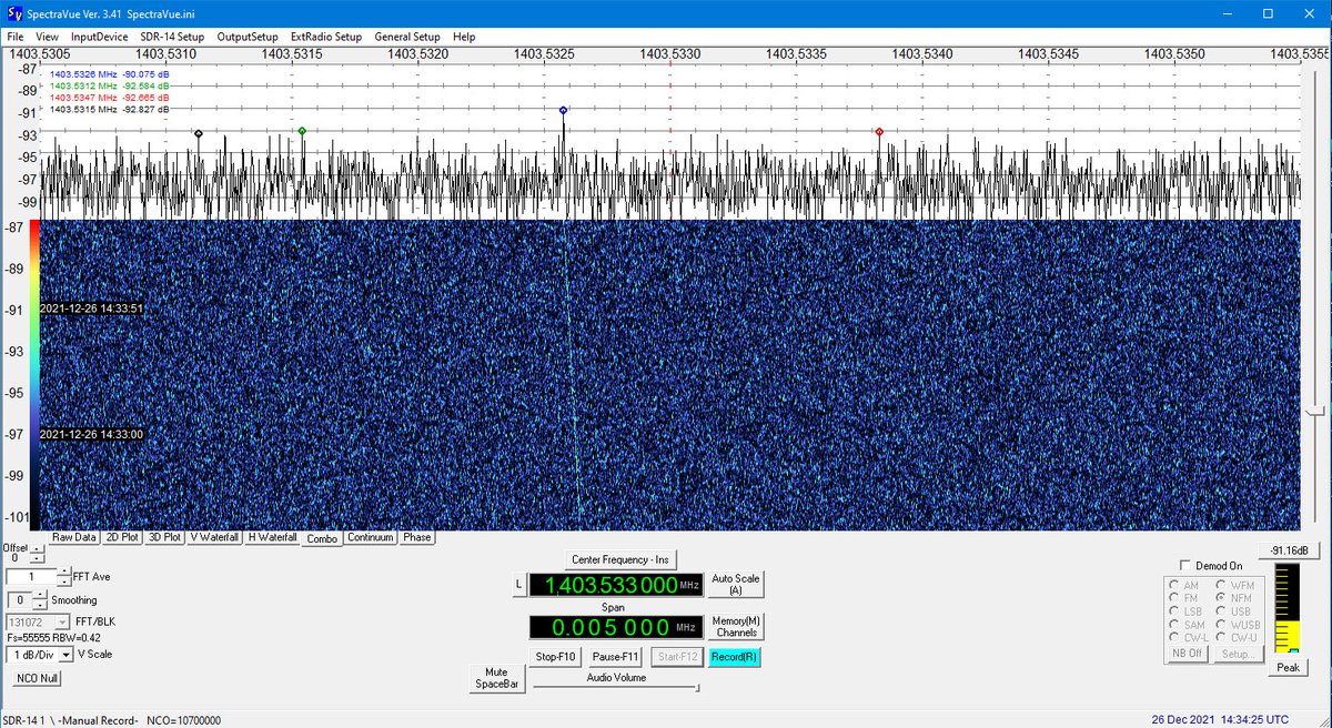 Sanity check on x-band. Stereo-A with light sidebands on 8443.540 MHz and faint signal from Juno spacecraft on 8403.533 MHz which is 825 Million Km from Earth. As