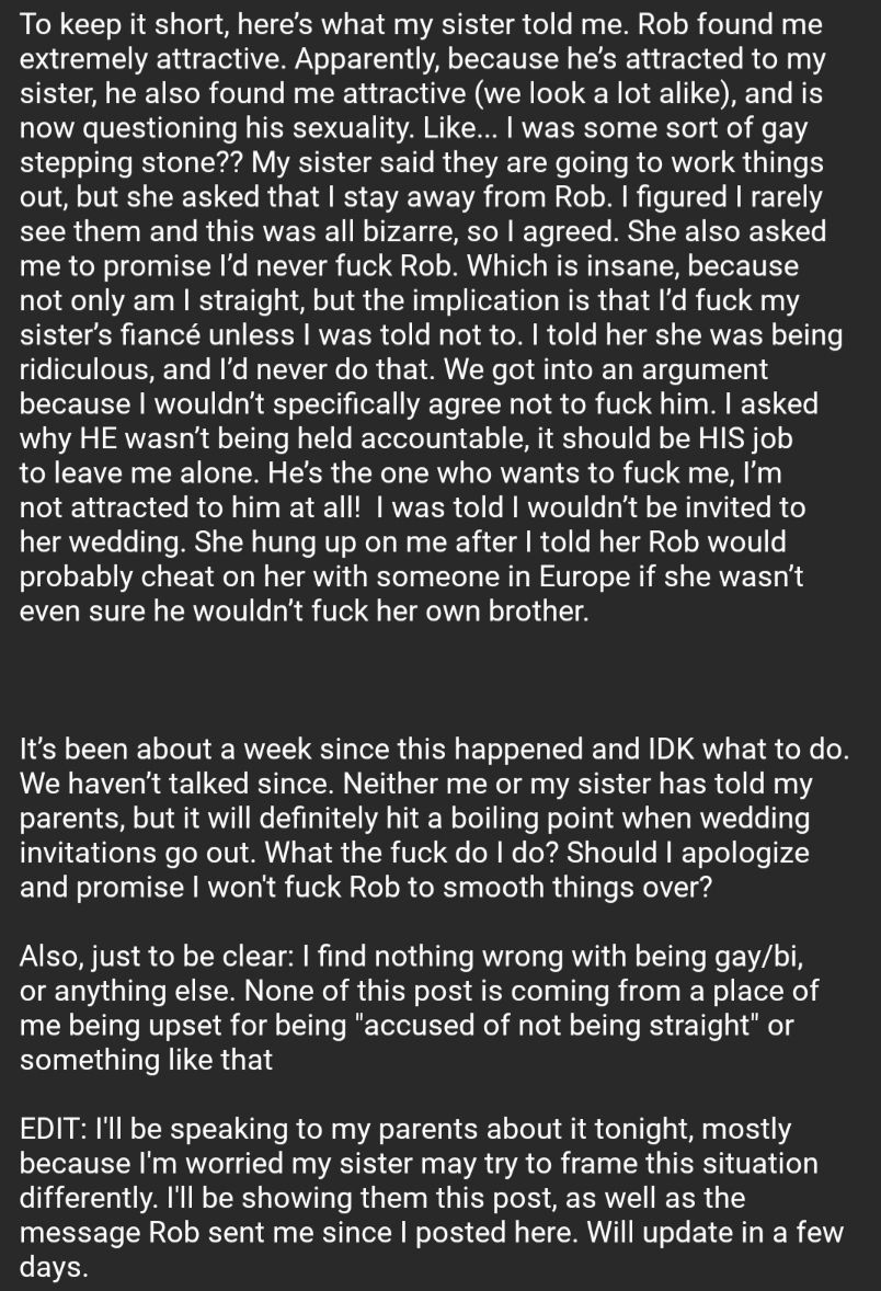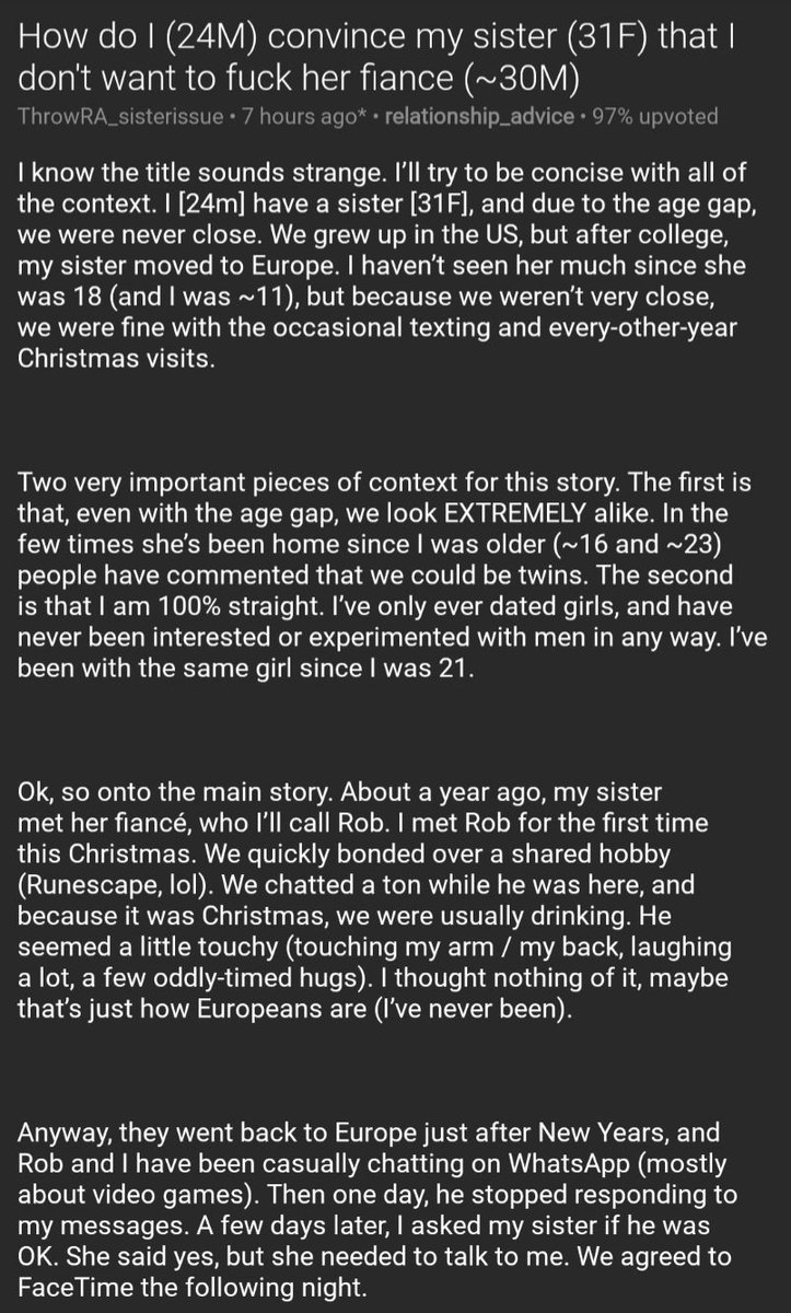 How do I (24M) convince my sister (31F) that I don't want to fuck her fiance (~30M) https://buff.ly/2t7NDuw pic.twitter.com/4HVvGtqDVO