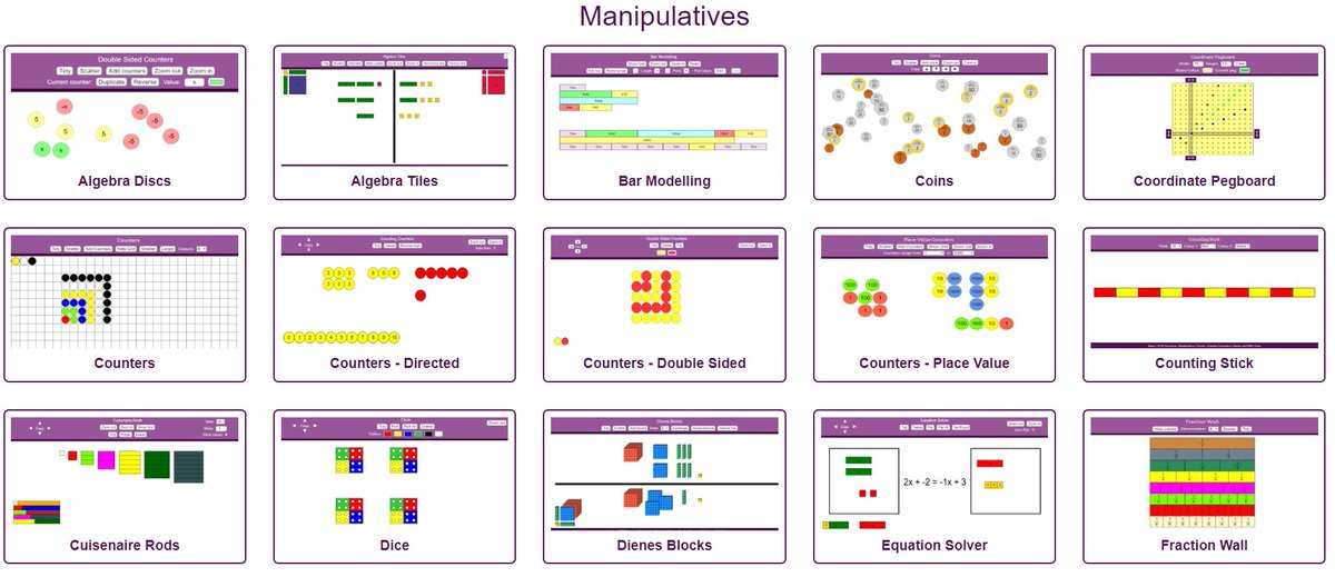 One of the best resource online for mathematics - https://mathsbot.com/#Manipulatives Everything in one neat website: - manipulatives - question generators - puzzles - ladders of difficulty for each topic - test generators - starters and drills - nets - printables