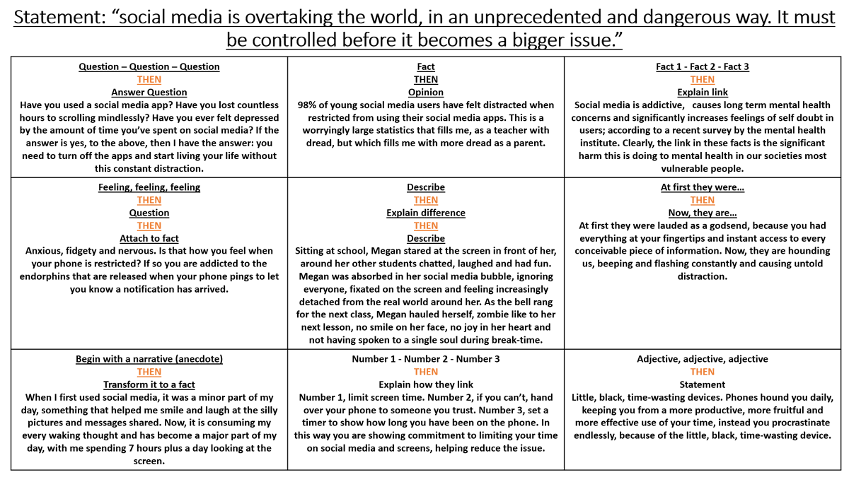 @_krogg's excellent (@Xris32 influenced) non-fiction sentence prompts, I've put together a social media model to round off viewpoint writing with Y11 tomorrow. Thanks to Kirsty for the structures and letting me share: https://www.dropbox.com/s/mj420dcpisr6ol6/non%20fiction%20sentence%20structures%20to%20attempt.pptx?dl=0 …pic.twitter.com/q68WkXylXk