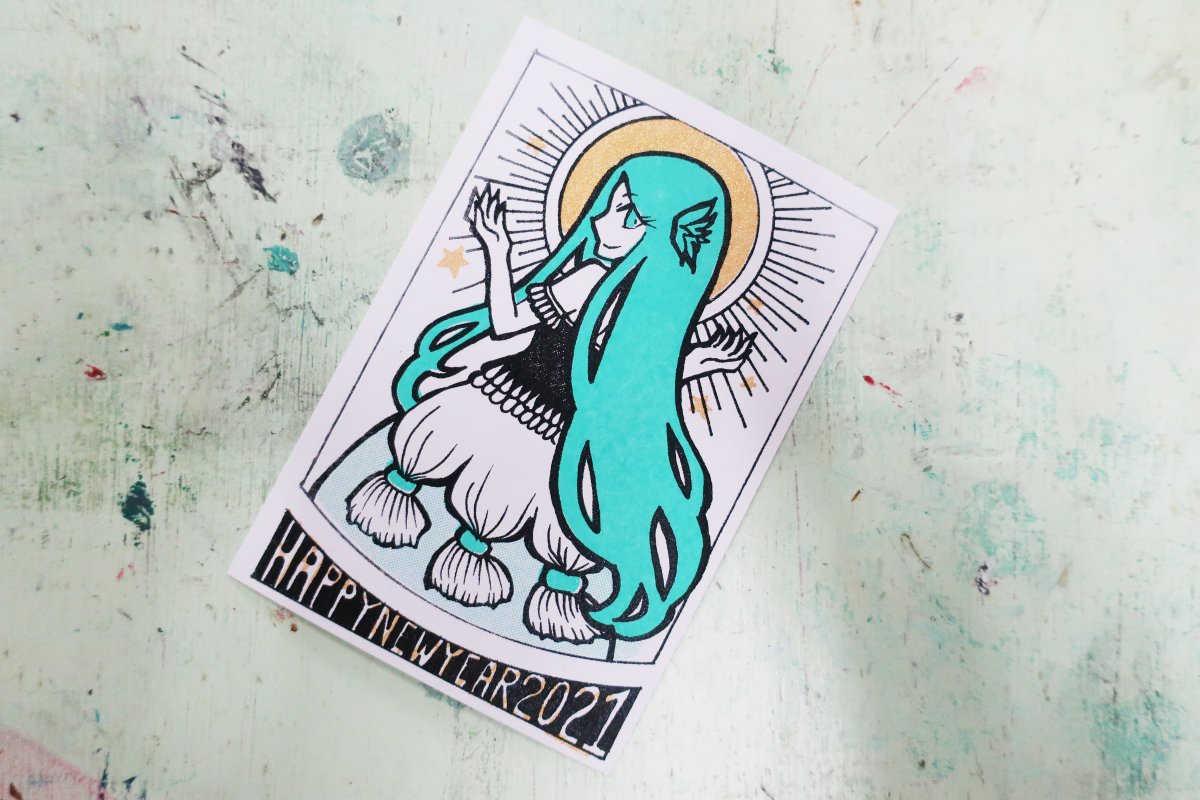 #みんなの作品】 火丁(あかり)さんの年賀状は、ミント×金×黒の3色刷り