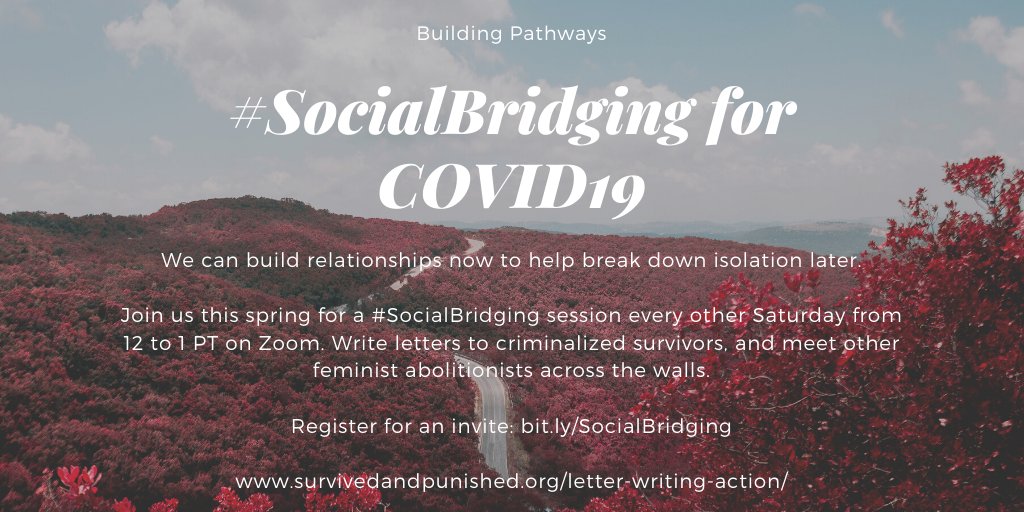 Have you signed up for a #SurvivedandPunished #SocialBridging session? Spend an hour of your Saturday afternoons building w/ abolitionist feminists! We'll write letters to incarcerated survivors, take action steps to #FreeThemAll & share company. Register:http://bit.ly/SocialBridging