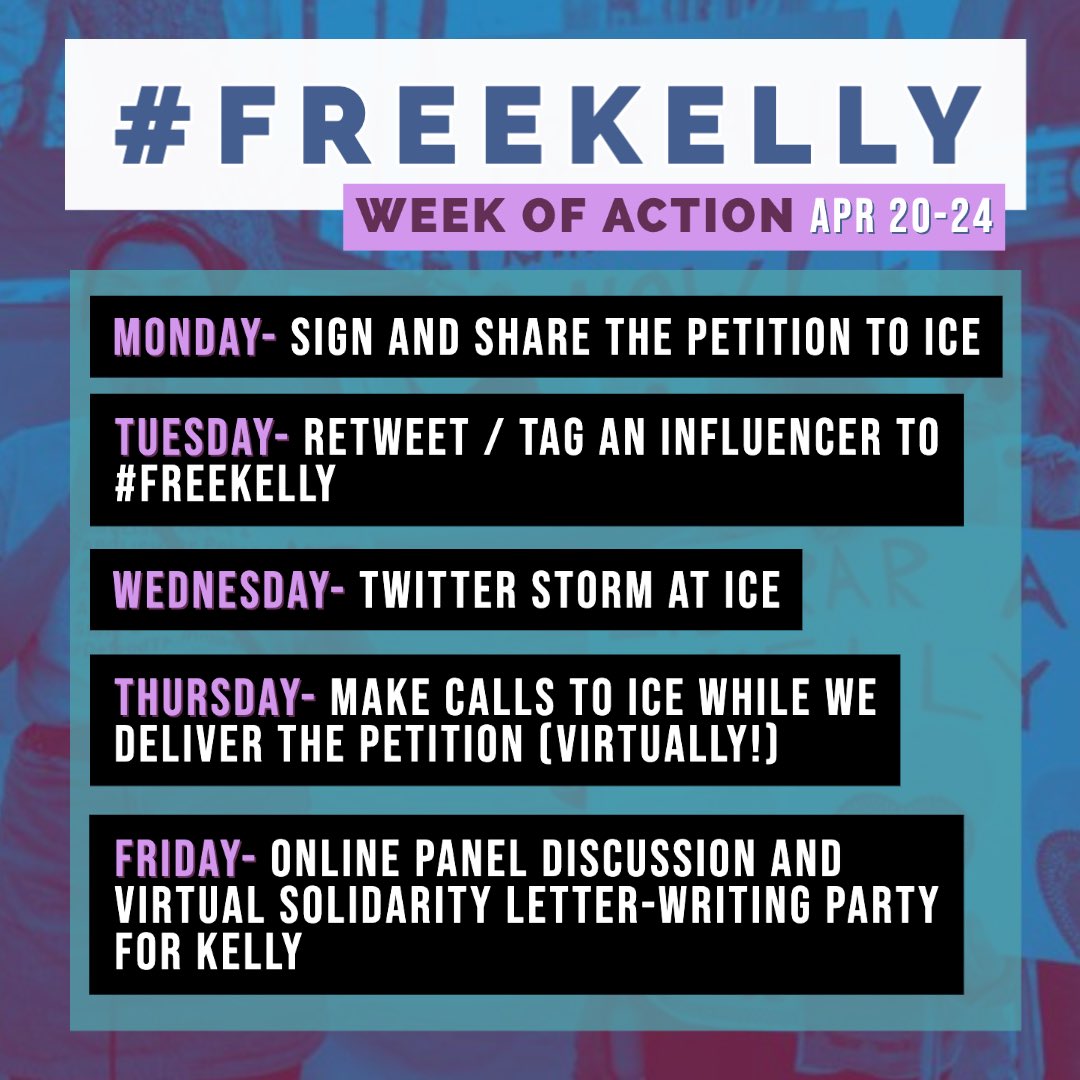Check out the week of action to #FreeKelly! Kelly is a trans asylum seeker, who has been in immigration detention for almost 3 years. See below tweet from @TransLatina_C for more information.