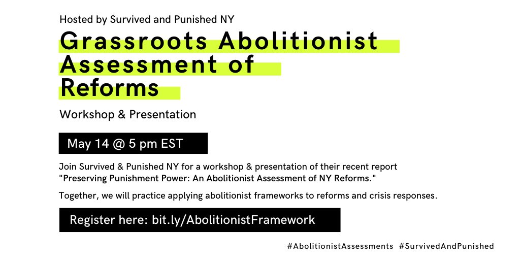 May 14 5-7 ET: @survivepunishNY will host a webinar, Grassroots Abolitionist Assessment of NY Reforms on their report "Preserving Punishment Power."