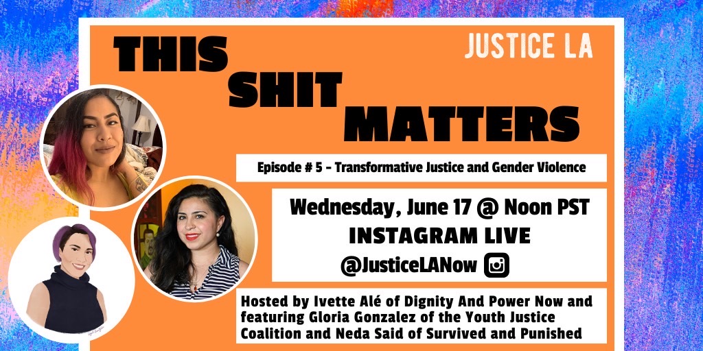 Join us tomorrow 4 #ThisShitMatters on #JusticeLA IG Live @ 12PM PST! Tomorrow's talk will be hosted by Ivette Alé of @PowerDignity feat. Gloria González of @YouthJusticeLA & Neda Said of @SurvivePunish ! These visionary folx will talk transformative justice & gender violence! pic.twitter.com/KstVBZga6I