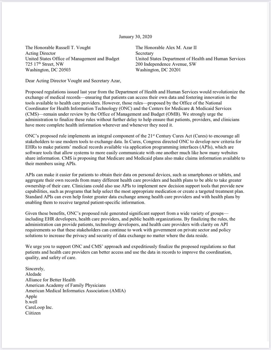 @benmoscovitch@jefferyrlsmith for facilitating this letter pushing for finalization of the API elements of the@ONC_HealthIT@CMSGov rules@SecAzar@SeemaCMS@donrucker@CareLoop@switz1122 are pleased to be includedhttps://twitter.com/benmoscovitch/status/1222899156169019400 …