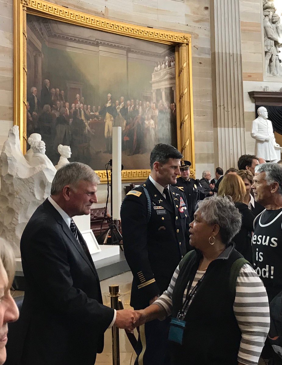 In Capitol Rotunda @Franklin_Graham greets mourners paying respects to @BillyGraham. At right is Franklin’s son Edward (an Army Ranger).pic.twitter.com/Duuy4vnkHn