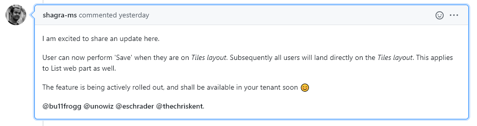 @shreyansh_a! Tiles can be the default layout in both the list view and the list web part!! https://github.com/SharePoint/sp-dev-docs/issues/4763#issuecomment-671256944 …pic.twitter.com/A04fhiqBzJ