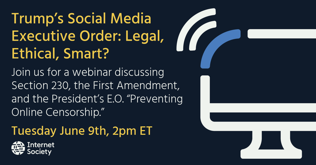 #Section230 - Unintended consequences? Join the Internet Society on June 9 for a timely conversation discussing the President’s Executive Order targeting social media platforms. Sign up: https://bit.ly/2Y64SHV#StrongInternetpic.twitter.com/xHCAFyhsZw