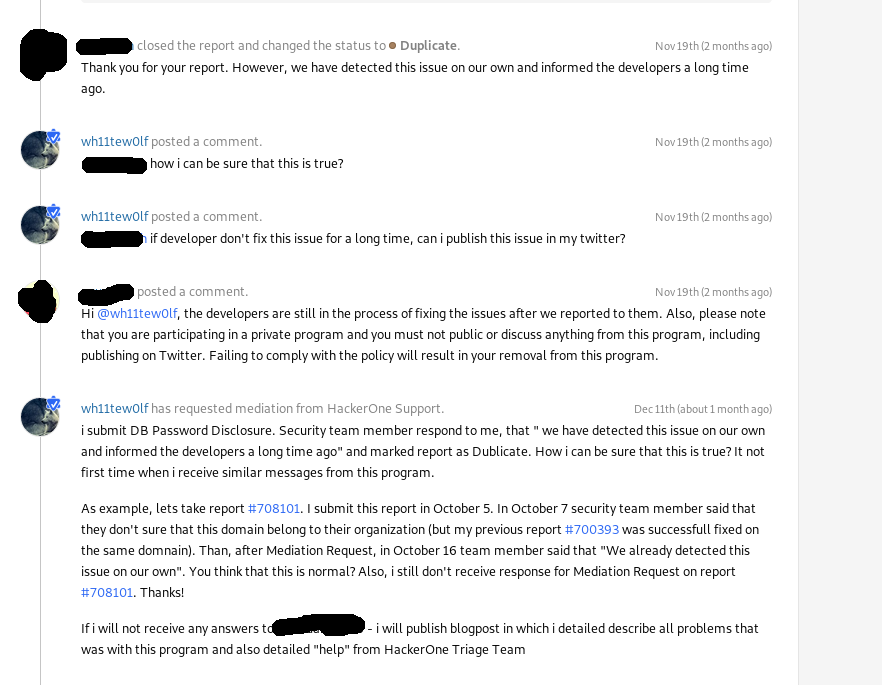 @Hacker0x01 blocked me, because program member close my report as Low severity (Oauth token leak) and i say that this program member is liar... I ask@Hacker0x01 to look again for this report, but no respone was given. But for "liars" thay react very fast. Ok, no problem.pic.twitter.com/jTDWV7BDTQ