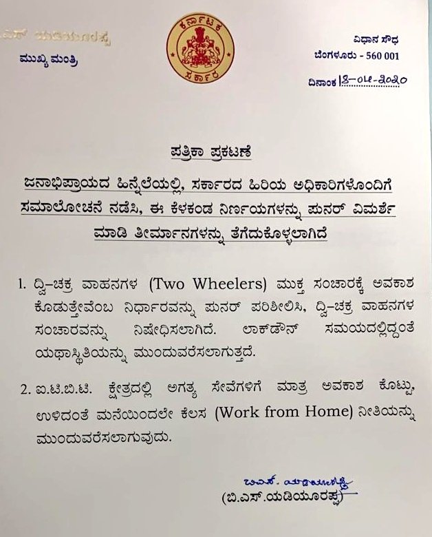 ಜನಾಭಿಪ್ರಾಯದ ಹಿನ್ನೆಲೆಯಲ್ಲಿ, ಸರ್ಕಾರದ ಹಿರಿಯ ಅಧಿಕಾರಿಗಳೊಂದಿಗೆ ಸಮಾಲೋಚನೆ ನಡೆಸಿ, ಈ ಕೆಳಕಂಡ ನಿರ್ಣಯಗಳನ್ನು ಪುನರ್ ವಿಮರ್ಶೆ ಮಾಡಲಾಗಿದೆ.