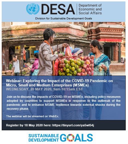 Join @UNDESA for a webinar on the impacts of#COVID19 on Micro, Small & Medium Enterprises (#MSMEs) and a discussion on how to boost their resilience in challenging economic circumstances. Sign here by 18 May: https://tinyurl.com/ya5wl54j#GlobalGoalspic.twitter.com/vYSAMI9cVj