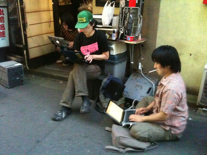 スマホ普及以前、ストリートコンピューティングという言葉があった。簡単に言うとお外でラップトップを使うことだが、その中でも小池スタイルと呼ばれる、立ったままラップトップを使う手法まで編み出されていた(画像参照)スマホ普及で廃れちゃったけどね…pic.twitter.com/2initNt2Ih