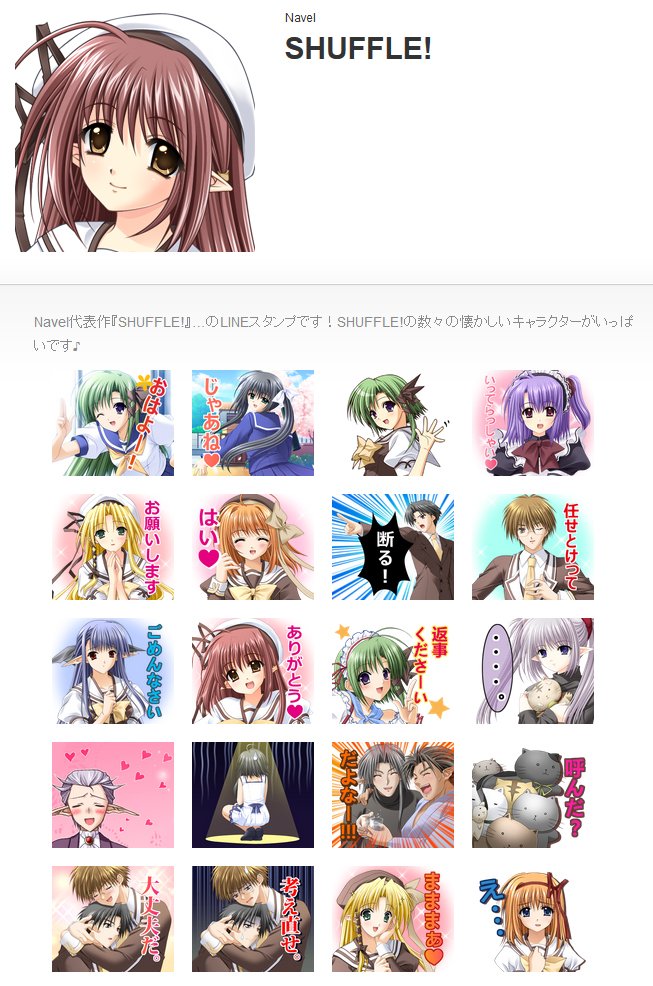 【LINEスタンプ情報】Navel作品『SHUFFLE!』の“LINEスタンプ”が登場しました(*´∀`*)ぜひ使ってみてください♪♪ http://line.me/S/sticker/1234629 … pic.twitter.com/WOnUDTzO6V