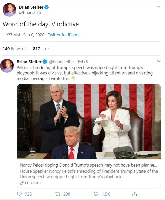 Compare Brian Stelter's reaction to Nancy Pelosi ripping up the State of the Union speech and President Trump's address to the nation today to see exactly why he won the Liberal Hack tournament.pic.twitter.com/E1o1FZ0H0C