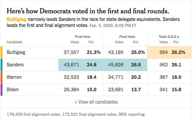 AP says it cannot declare winner in Iowa Democratic caucus, based on arcane SDE calculations. But with 99% reporting, Sanders has 6,114-vote (3.5 percentage point) lead in first vote, 2,631-vote (1.6 point) lead in second vote. Neither is too close to call. Sanders won.pic.twitter.com/mXKwgb1OMb